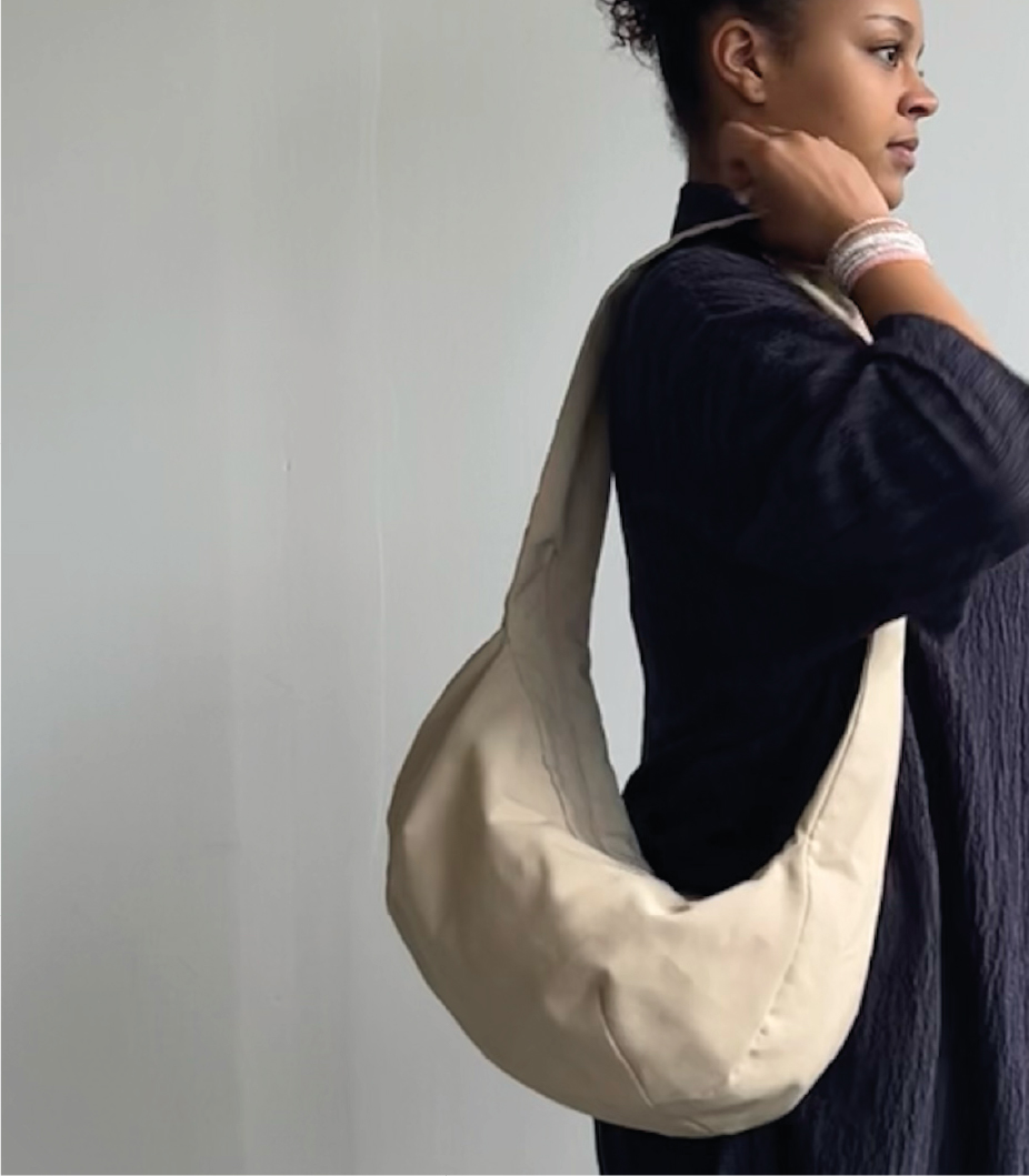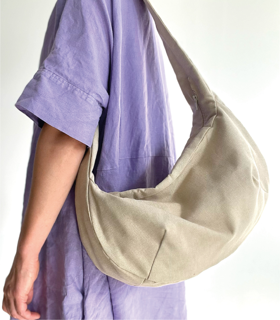 The Saturday Bag is a semi-circular shoulder bag with a wide shoulder strap