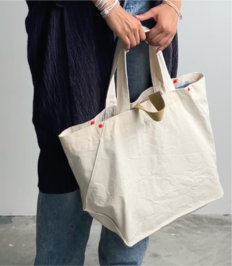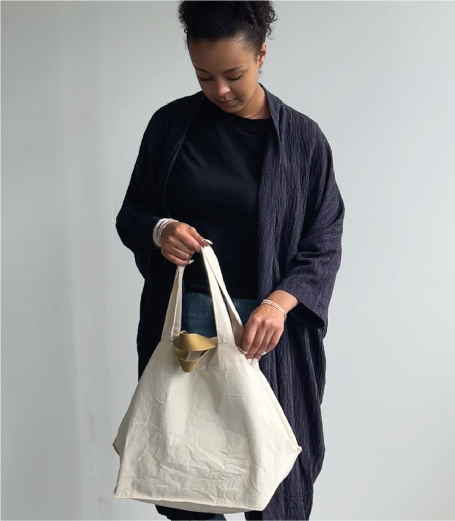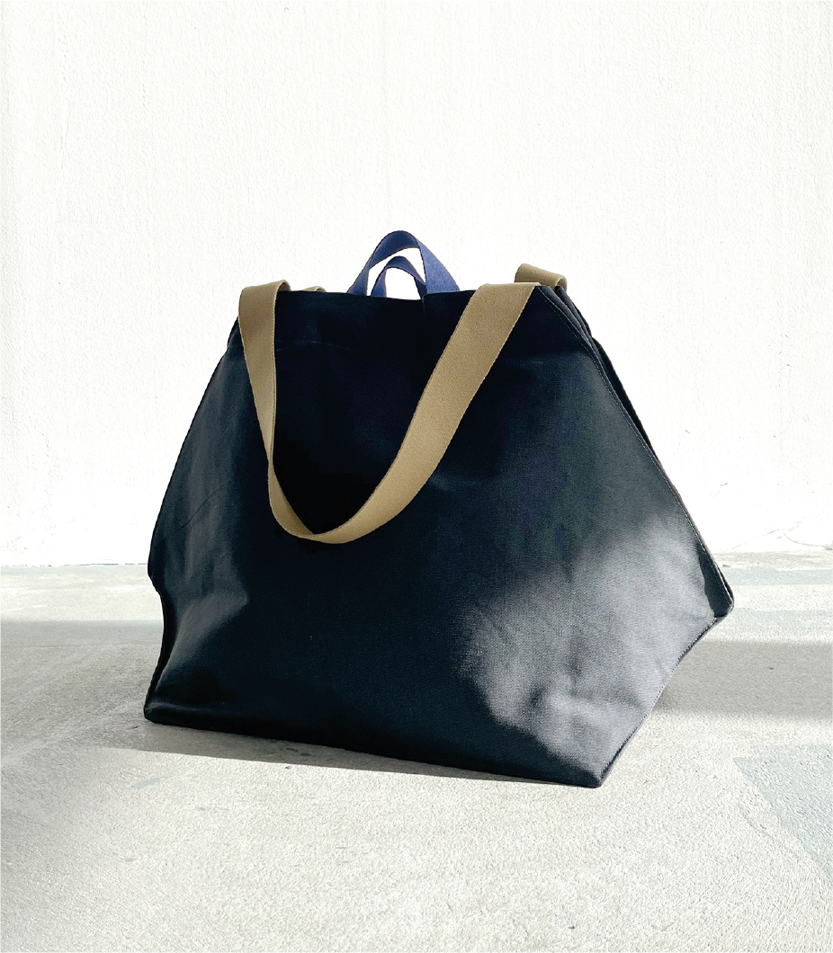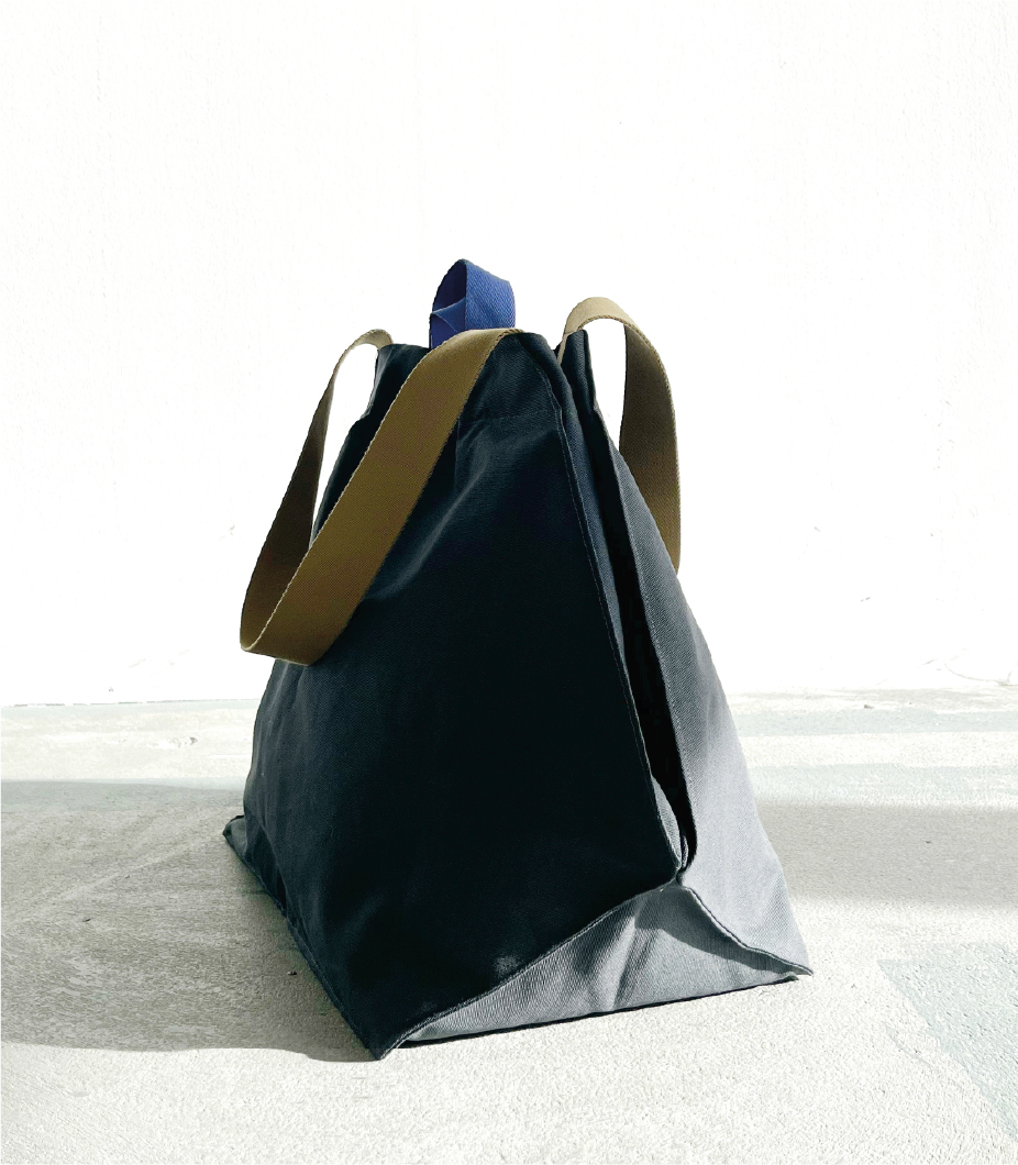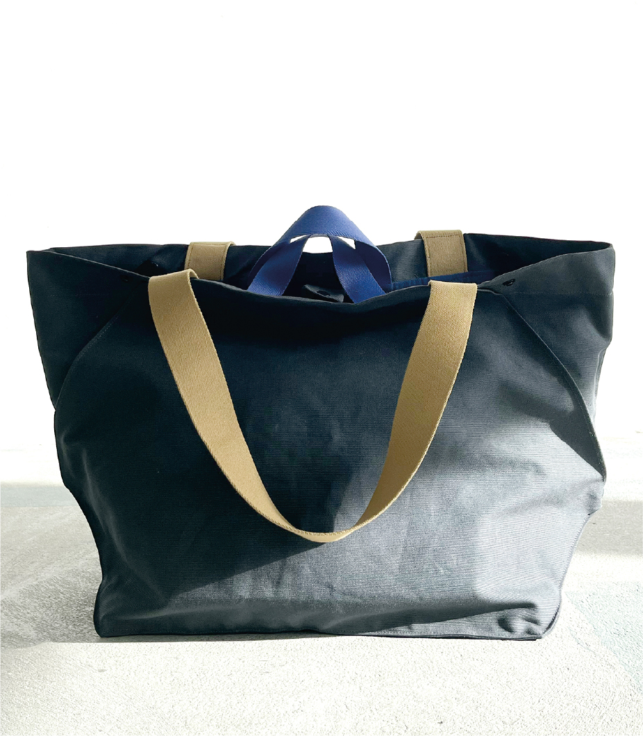 The Sunday Tote has a graphic cut and can change its shape and volume. If you fold the sides inwards and fasten them with the press studs, the